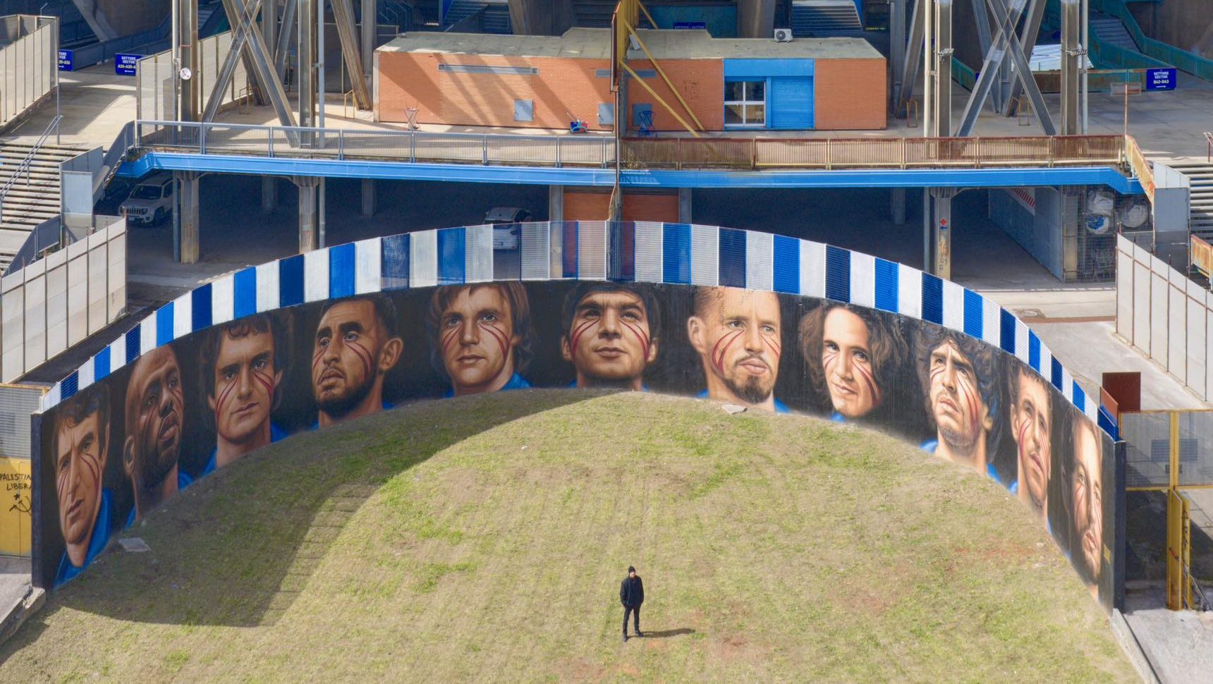 L’opera raffigura undici protagonisti emblematici della storia azzurra, selezionati direttamente dai tifosi attraverso i canali social dell’artista. Accanto a Bruscolotti trovano spazio nomi che hanno segnato epoche diverse del club: Dino Zoff, Kalidou Koulibaly, Ruud Krol, Faouzi Ghoulam, Antonio Juliano, Marek Hamšík, Edinson Cavani, Diego Armando Maradona, Dries Mertens e Careca.
