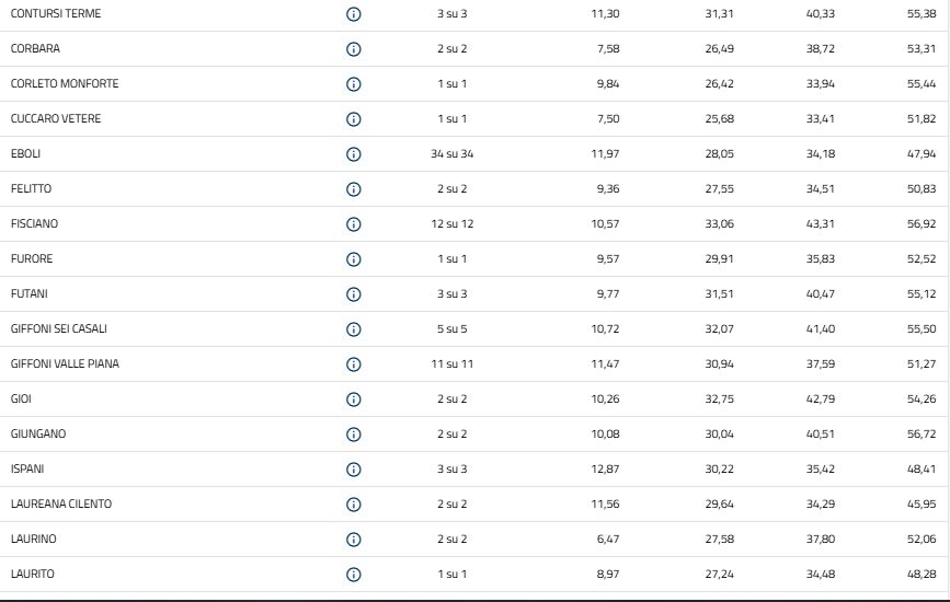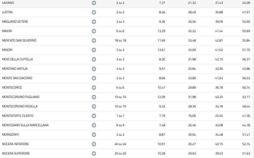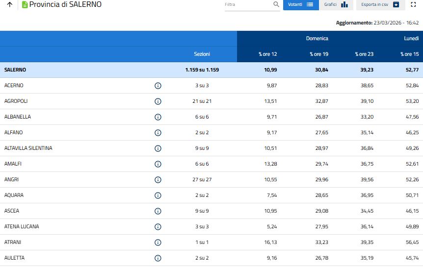Per quanto riguarda il salernitano. Di seguito i dati sull’affluenza per quanto riguarda Salerno e Provincia dove la partecipazione si attesta al 52,77% secondo Eligendo.