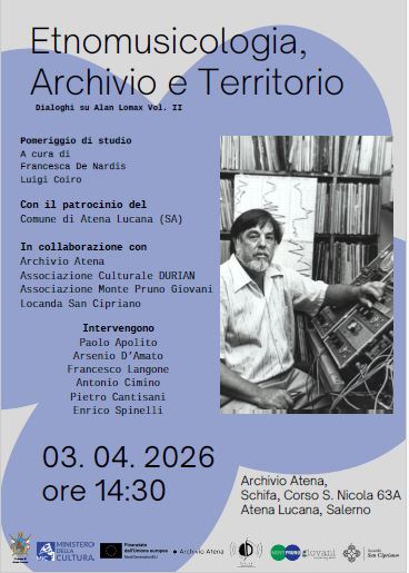 Sarà il centro storico di Atena Lucana a ospitare l’incontro “Etnomusicologia, Archivio e Territorio. Dialoghi su Alan Lomax Vol. II”, appuntamento dedicato alla ricerca e alla valorizzazione del patrimonio culturale immateriale del Vallo di Diano.