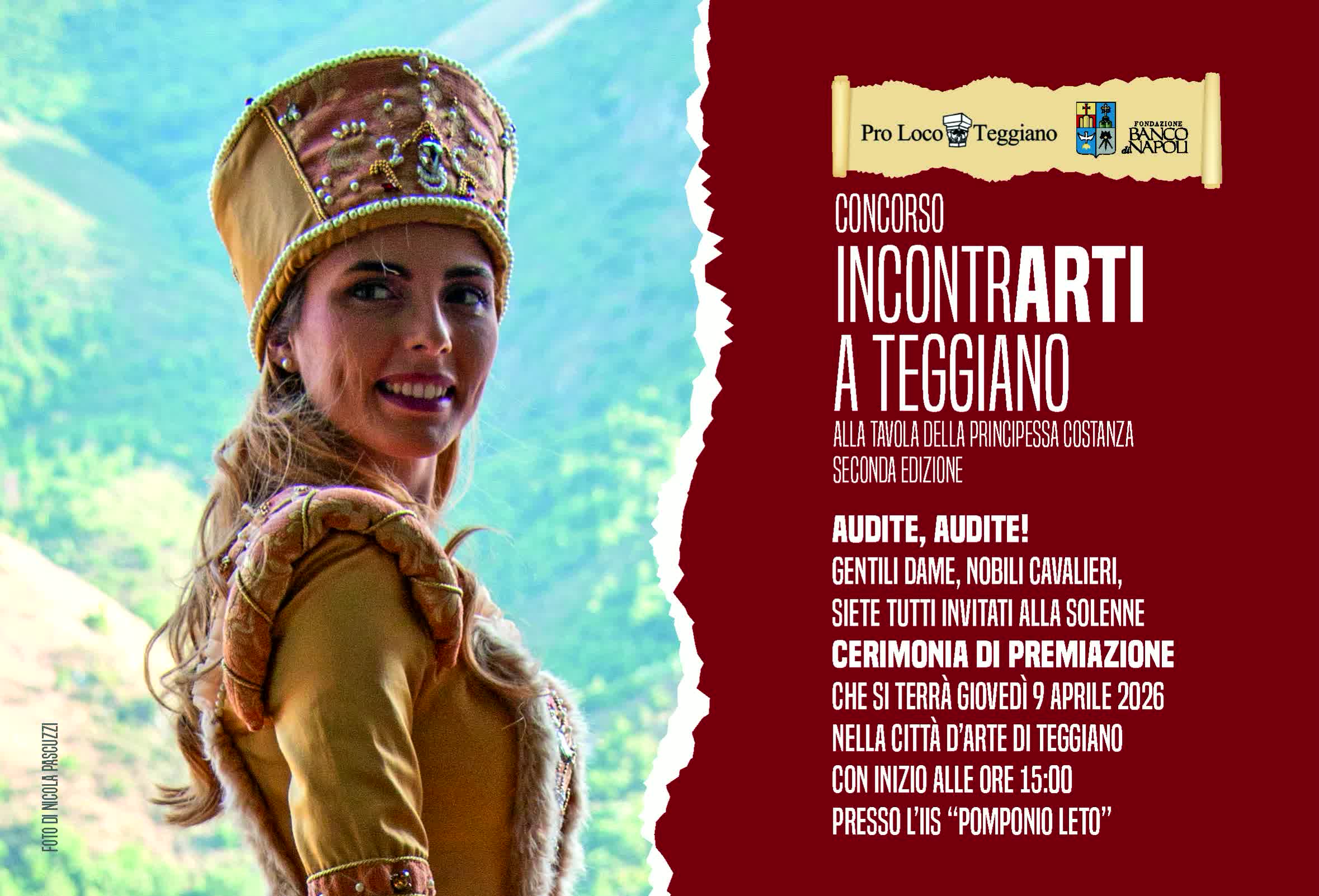 Si conclude la seconda edizione del concorso multimediale “IncontrArti a Teggiano – Alla Tavola della Principessa Costanza”, con la cerimonia di premiazione in programma giovedì 9 aprile 2026 alle ore 15.00 presso l’Istituto di Istruzione Superiore “Pomponio Leto”, scelta simbolica per coinvolgere direttamente il mondo della scuola e avvicinare i giovani alle iniziative culturali del territorio; l’iniziativa, promossa dalla Pro Loco Teggiano e sostenuta per il secondo anno consecutivo dalla Fondazione Banco di Napoli, è legata alla storica manifestazione estiva “Alla Tavola della Principessa Costanza” e ha rappresentato un’importante occasione per raccontare Teggiano attraverso linguaggi creativi e multimediali, valorizzandone storia e identità; durante la kermesse i partecipanti hanno realizzato contenuti innovativi con l’obiettivo di promuovere il patrimonio culturale locale.
