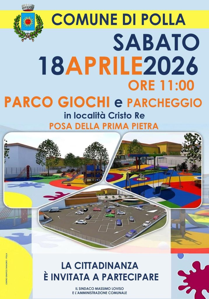 Sabato 18 aprile, a Polla, si terrà la cerimonia di posa della prima pietra per la realizzazione del nuovo parco giochi e del parcheggio in località Cristo Re. Il progetto prevede la realizzazione di un’area moderna, sicura e inclusiva, pensata per il gioco, il tempo libero e la socialità, affiancata da un parcheggio funzionale a servizio della zona.