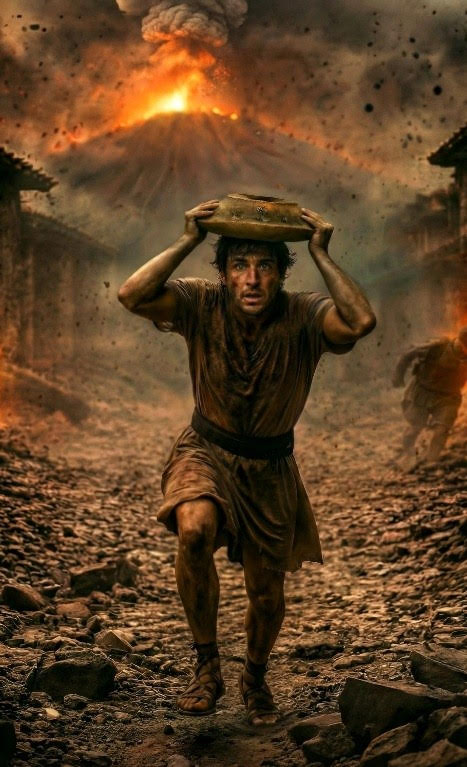 La ricostruzione riguarda un uomo morto durante l’eruzione del Vesuvio, che distrusse la città nel 79 d.C. in meno di 24 ore, ritrovato con un mortaio di terracotta, che sembra essere stato utilizzato come protezione durante la caduta di lapilli e frammenti vulcanici. Il gesto richiama le descrizioni di Plinio il Giovane, testimone oculare, che in una lettera riferisce come le persone in fuga dal vulcano cercassero di difendersi dal materiale eruttivo con cuscini legati sulla testa.